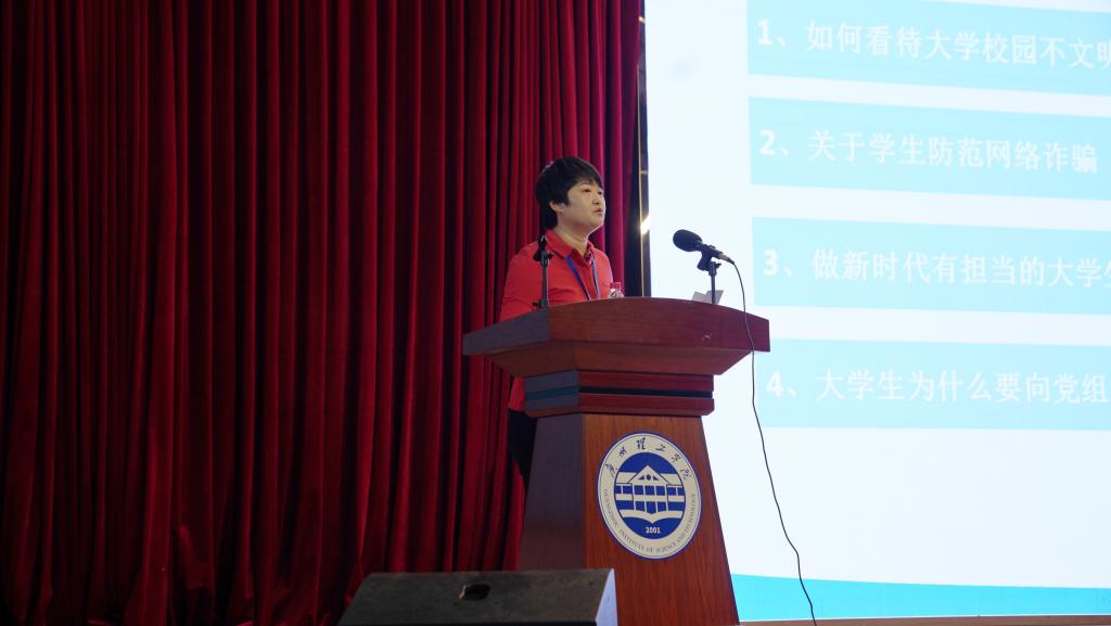 全艳副书记以“爱国、爱党、爱校”为题开讲“思政第一课”,从“如何看待大学校园不文明行为”“关于学生防范网络诈骗”“做新时代有担当的大学生”“大学生为什么要向党组织靠拢”等话题着手,结合当前大学生的学习生活状态进行讲授,希望同学们能够做到讲政治有信念、讲规矩有纪律、讲道德有品行、讲奉献有作为。努力为自身以及学校的发展做出应有的贡献。