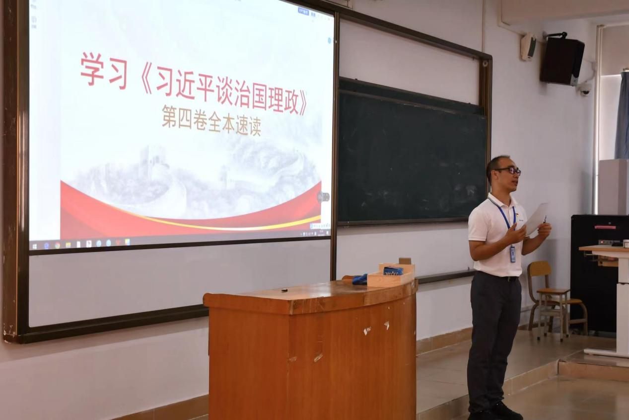 课上,颜冬果副书记强调,《习近平谈治国理政》第四卷具有重大意义重要地位,其中集中展现习近平新时代中国特色社会主义思想和马克思中国化的最新成果,全面系统反映习近平新时代中国特色社会主义思想的权威著作等。颜冬果书记重点分享了“加快建设社会主义法治国家”的内容,并结合当前校园中个别学生出现疫情防控心态松懈等问题,要求同学们严肃对待国家关于疫情防控常态化的管理措施,共同遵守学校疫情防控的相关规定,共同守护好自己与周围老师生生命的健康和安全。
