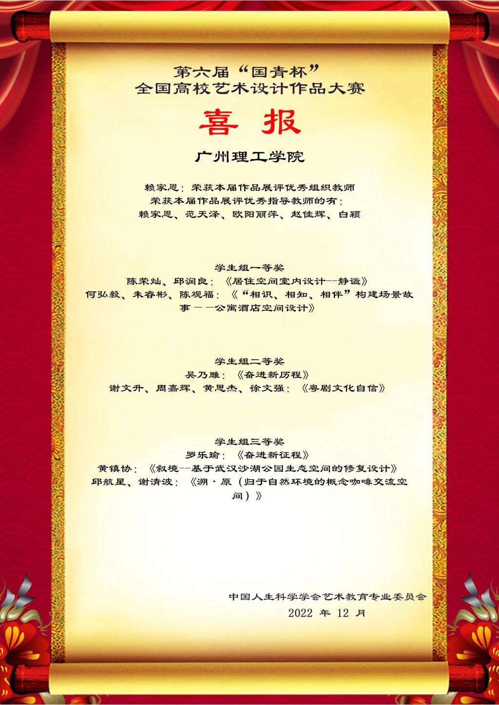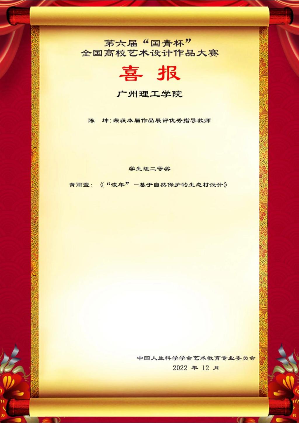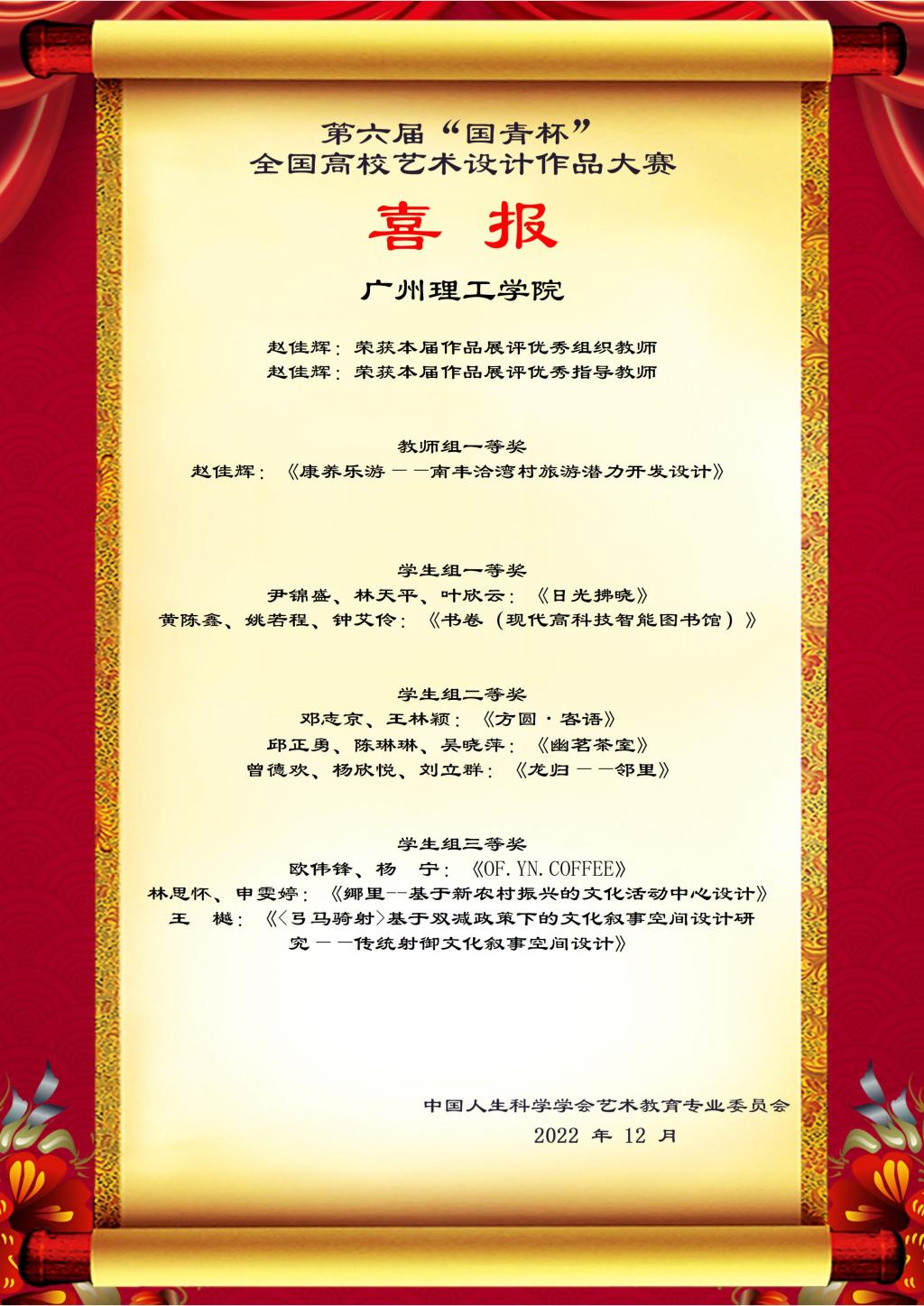 12月,由中国人生科学学会艺术教育专业委员会与国青杯艺术与设计大赛组委会共同主办的第六届“国青杯”全国高校艺术与设计作品大赛获奖名单揭晓,面向全国各高等院校艺术与设计类专业的在校专科生、本科生、研究生、在职教师及科研工作者。贯彻落实党的二十大精神,深化高等教育改革,推动高等教育内涵式发展,加大国内外艺术与设计人才的交流合作,探索高等院校艺术与设计师生的发展方向。旨在鼓励原创,激发个性化、创新思维,展示艺术与设计最新成果,传播艺术与设计最新理念,通过作品的国内交流、国际交流,实现高校师生具有前沿的设计理念和国际化视野。