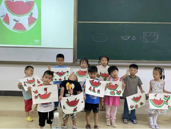 本周课程以“蚂蚁西瓜”为主题,小老师通过绘本阅读带领孩子们理解画面的主要情节,观察角色的动态、表情,以及背景,引导同学们观察蚂蚁与西瓜间所发生的故事展开绘画活动。小朋友们大胆操作创作,用线条符号添加,突出蚂蚁的动态特征,将蚂蚁搬西瓜的场景表达呈现画面。