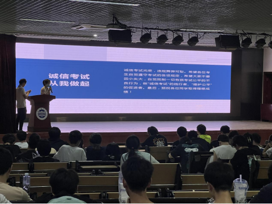 紧接着,学习委员向同学们复述了学校学生手册中有关考试作弊的处理办法,使同学们深刻认识到了学院对于学生诚信意识培养、“诚信应考”的重视及对作弊现象的坚决打击。