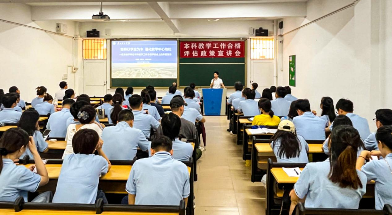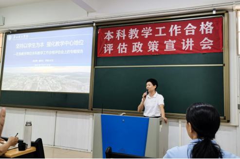 陈英征部长作了关于“规范教学行为,提高教育教学水平和人才培养质量”的报告。陈部长对合格评估方案的核心内容中“一个引导”“两个突出”“三个基本”“四个促进”进行阐述,要求全体教师主动学习与教学相关的规章制度(含上级文件、校级文件)、积极参与集体备课活动、用平常心、正常态去对待评估,以学习心、开放态来参与评估。