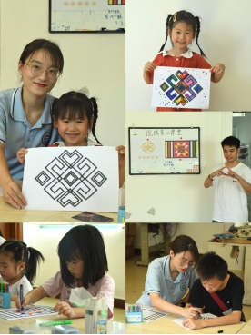 7月13日,团队将瑶绣与美术绘画结合进行瑶绣第二课堂美育教学活动,小朋友们使用填色的方式为瑶绣的具体纹样进行填色。