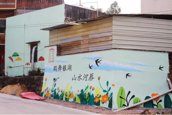 在创作过程中,团队志愿者们以“鹤舞银湖,山水河唇”为主题,创作出了一副乡村美图。绘画过程中,团队成员们不畏辛劳,在烈阳下分工合作进行彩绘,成员之间相互支持、相互鼓励,当遇到技术上或创作上的难题时,他们会积极沟通、充分交流,共同寻找解决方案,努力将每一步都做到最好,附近村民们的热心、鼓励和支持成为了团队前进的动力源泉。
