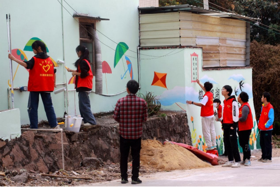 在团队志愿者的共同努力下,一面,两面,三面美图跃然墙上,墙绘地位于河唇镇交通要道。朴实的画风、接地气的内容让这几幅画成为了村里的一道靓丽的风景线,路过的行人都会驻足停留,欣赏这一幅充满生机的画作。