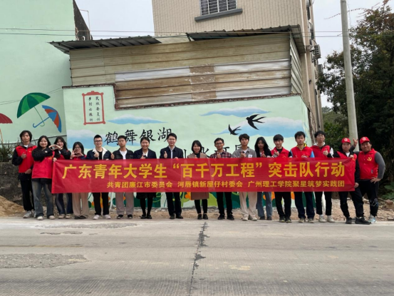 (叶保军)续石岭镇墙绘活动的结束,为大力支持乡村文化建设,助力“百千万工程”,广州理工学院聚星筑梦实践团志愿者们通过学校与团廉江市委的对接,2024年1月17日开启了廉江市河唇镇的乡村美化墙绘活动。此次绘画墙面位于河唇镇新屋仔村委会香园村。