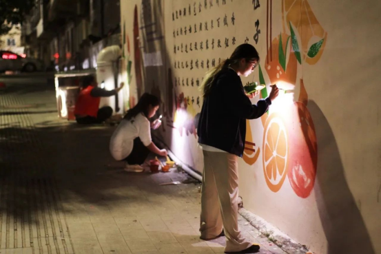 在创作过程中,云顶千舟艺术实践团成员结合廉江特产红橙与石岭乡村特色,设计出了富有创意的方案,将美丽乡村的景色、民俗文化等元素融入墙绘中。聚星筑梦实践团配合一起对方案进行绘画。