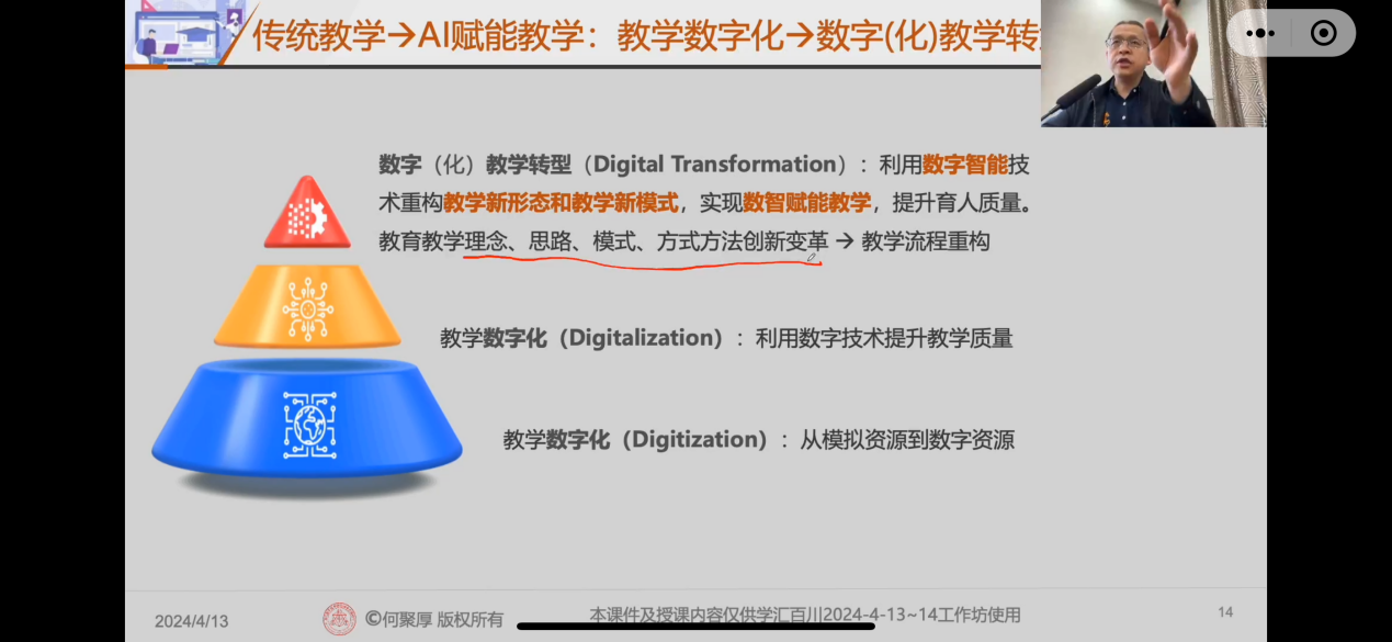 2024年4月13日上午,通过“从教师数字素养发展到数字化教学转型”的主题演讲,探讨了数字化教学的理念、思路与途径。演讲强调了智慧教学发展途径,包括数字化教学转型与教师数字素养的提升。此外,介绍了基于大语言模型如ChatGPT的AI技术概述,以及这些技术如何赋能现代教学。