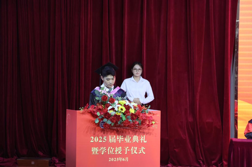 典礼上,学院领导为优秀毕业生颁发了荣誉证书,并举行了庄重的学位授位仪式。毕业生们依次上台接受“拨穗礼”,并与师长合影留念。仪式结束后,学生代表为学院老师、辅导员代表、家长代表献上鲜花,表达深深的感恩之情。