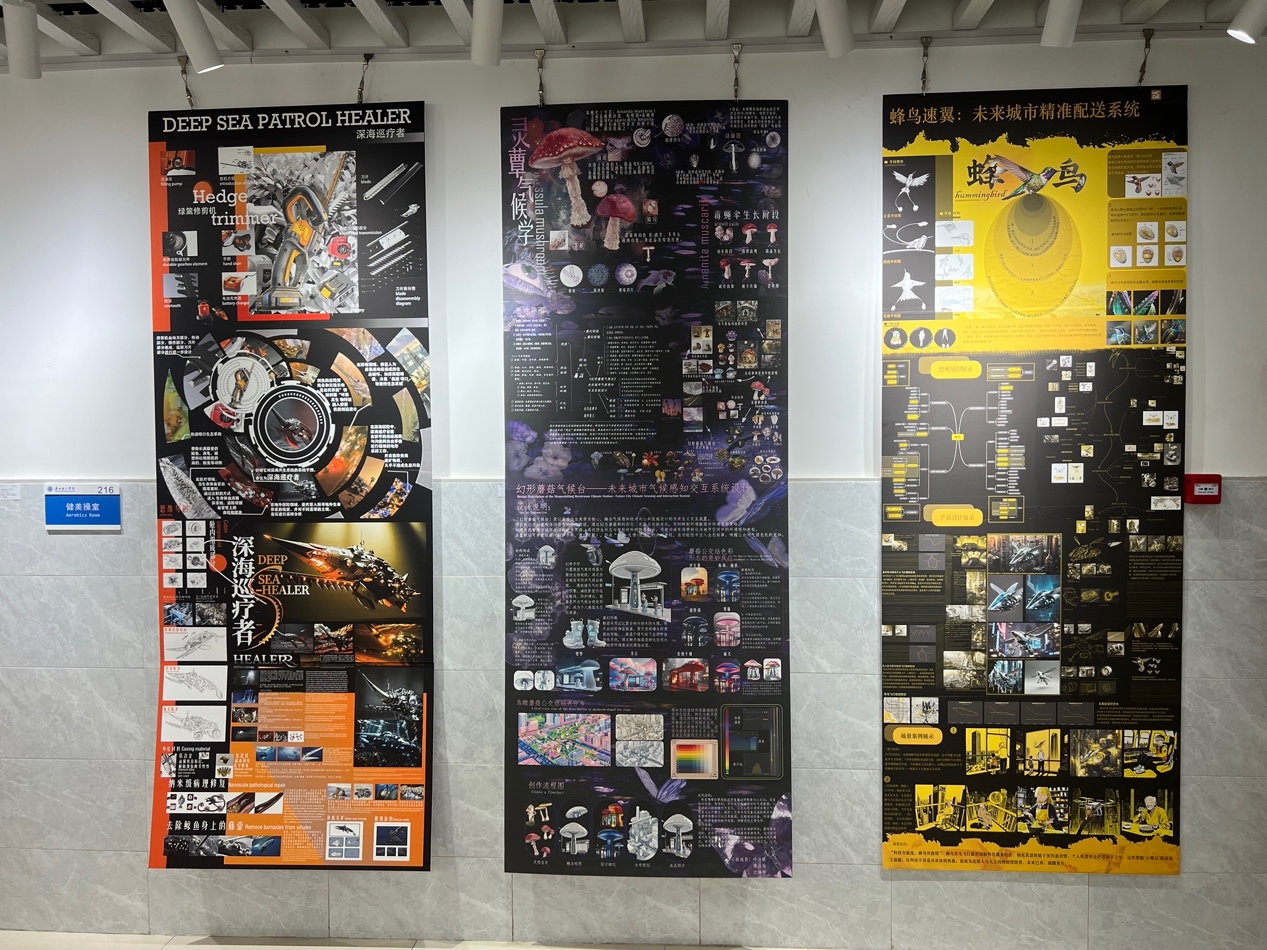 在AI融入教学方面,展览通过学生课程作业的完整呈现,展现了AI辅助设计工具在课程中的创新实践。学生们基于主题关键词构建算法逻辑链,运用扩散模型、神经风格迁移等技术生成创意素材,并延伸至动态故事版、参数化产品原型等设计领域。实现了技术理性与艺术感性的融合。展品均源自艺术设计大一基础课程作业,充分证明了AI工具与教学目标深度融合的有效性。