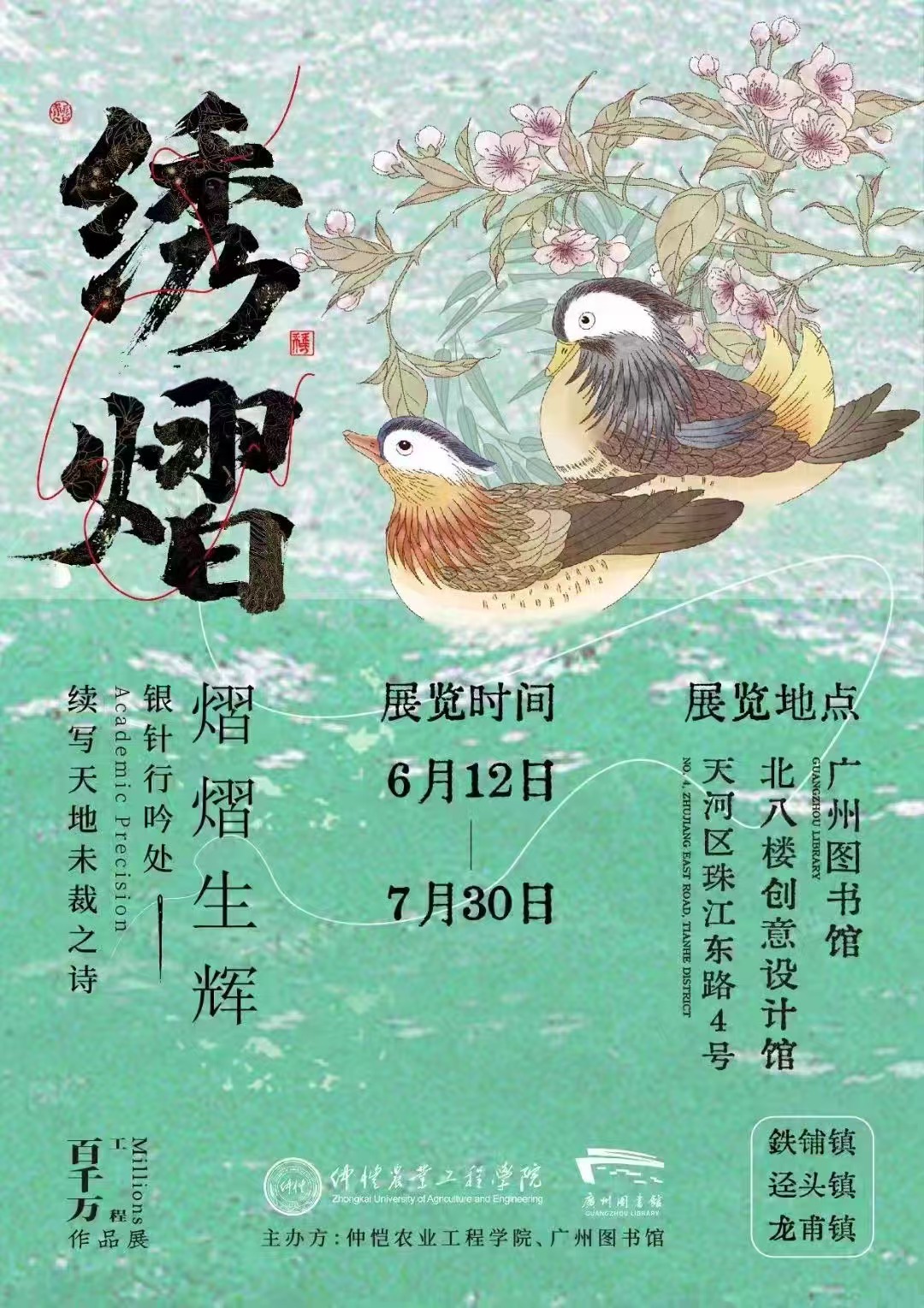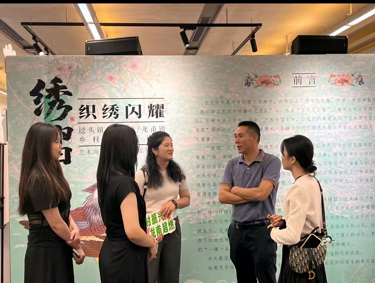 (张玉坤)6月14日,由仲恺农业工程学院与广州图书馆联合主办的“绣熠:织绣闪耀暨百千万工程迳头镇、铁铺镇、龙甫镇乡村振兴设计展”于广州图书馆北八楼展览区盛大启幕。展览以“非遗X乡村振兴”为主题,通过展览、织绣工坊两大板块,深度呈现织绣非遗的数字化创新与乡村振兴实践的融合成果,为观众打造传统与现代交织的文化体验空间。由广州理工学院、广东亚视演艺职业学院、广东创新科技职业学院三所院校所组成的龙甫镇农村科技特派员团队通过此次展览将展现团队在龙甫镇乡村振兴的阶段性成果。