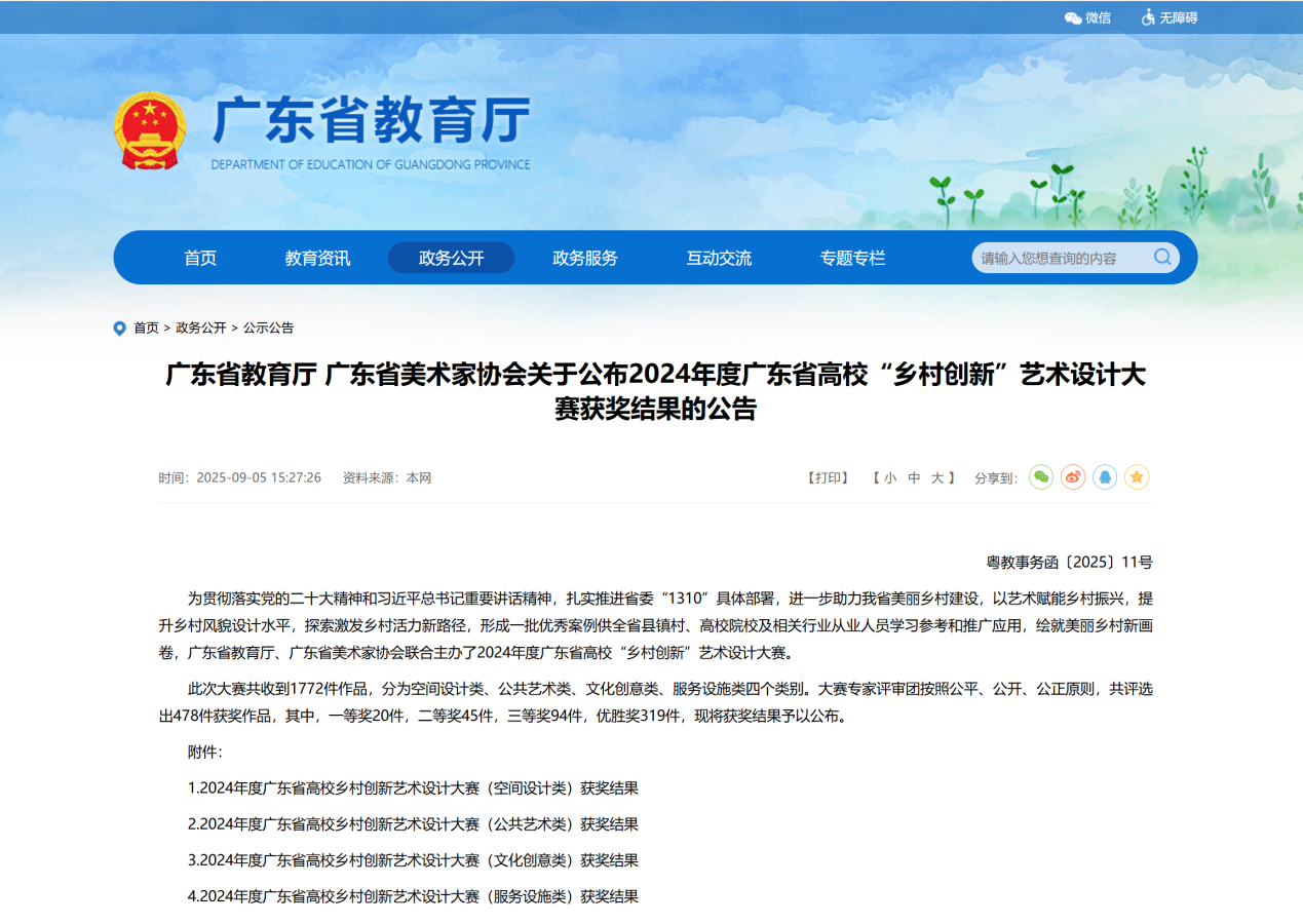 近日,广东省教育公布了2024年度广东省高校“乡村创新”艺术设计大赛获奖名单,suncitygroup太阳新城师生在本次竞赛中成绩斐然,获得一等奖1项,优胜奖5项的优异成绩。