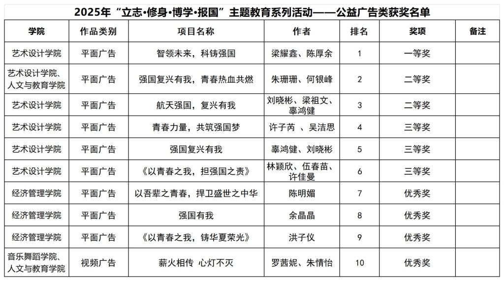 为学习贯彻习近平总书记关于高校思想政治工作的重要论述精神,深入实施“时代新人铸魂工程”,根据《广东省教育厅关于开展2025年“立志·修身·博学·报国”主题教育系列活动的通知》文件要求,结合学校实际,决定组织开展2025年“立志·修身·博学·报国”主题教育系列活动。本次活动包括7类项目:社会实践纪实类、讲述诵读类、歌曲传唱类、主题摄影类、公益广告类、舞台剧目类、教育微课类。现将公益广告获奖名单公示如下: