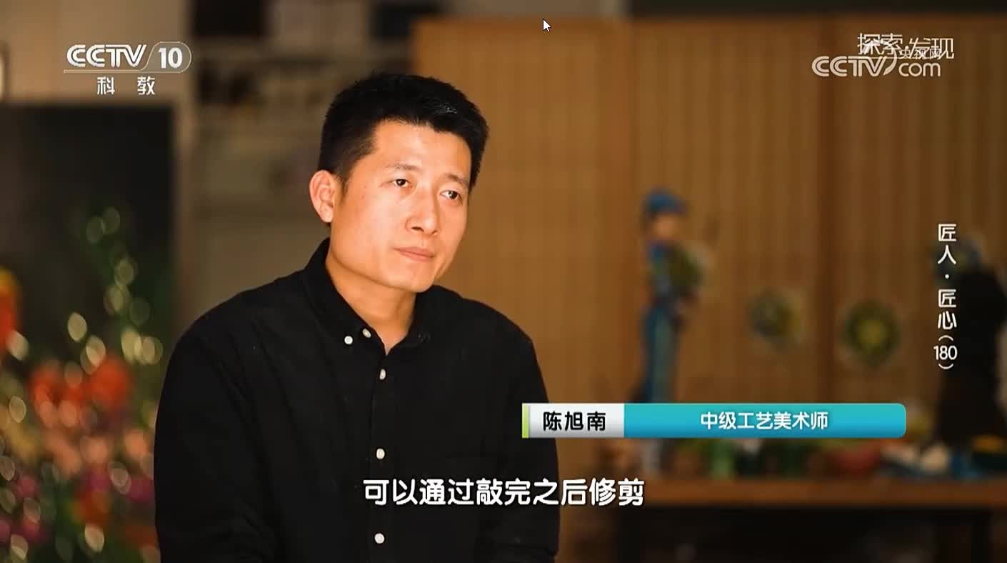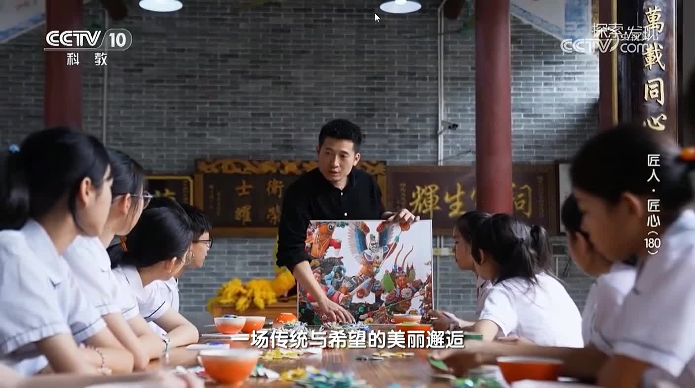 在2024年7月17日晚,中央电视台10科教频道《探索·发现》栏目“匠人·匠心”系列第180集中,展现了广东潮汕地区代代相传的的“非遗”传统工艺文化传承手法,其中漆器的色彩斑斓,木雕的立体生动,嵌瓷的缤纷绚丽,每一种工艺都凝聚着无数匠人的智慧与心血,诉说着古老文化的深厚底蕴与现代审美的和谐共通。广州理工学院特聘副教授陈旭南作为嵌瓷艺术的匠人代表向全国人民展现了他在嵌瓷领域的传承与创新。