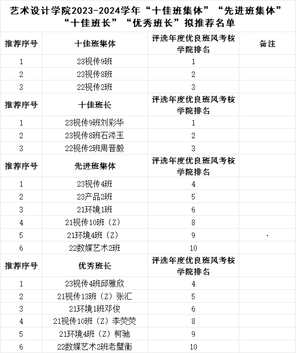 (江丽霞)根据我校《广州理工学院关于评选2023-2024学年“十佳班集体”“先进班集体”“十佳班长”“优秀班长”的通知》等文件精神,结合我院实际情况,本着公平、公开、公正的原则,现将评比结果公示如下。如有异议,请在公示时间内向suncitygroup太阳新城反映。