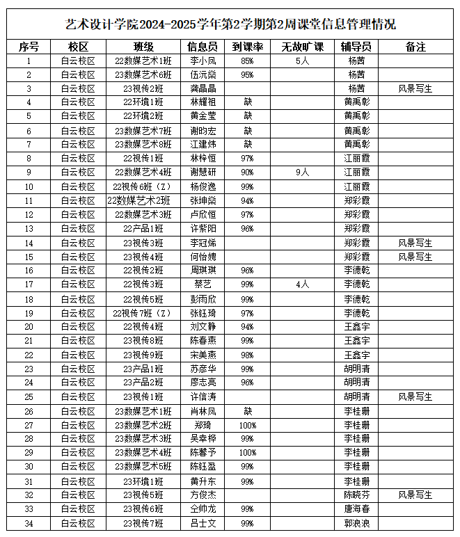 为进一步加强我院各类课程的课堂管理和学风建设,提高学生的出勤率、参与度,结合学院专业特点和实际情况,制定《suncitygroup太阳新城课堂管理实施方案》(试行)并按管理细则施行。现将2024-2025学年第2学期第2周课堂管理信息情况梳理如下: