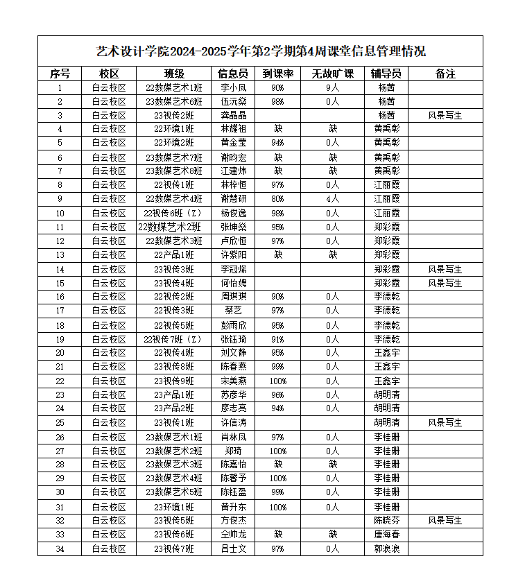 为进一步加强我院各类课程的课堂管理和学风建设,提高学生的出勤率、参与度,结合学院专业特点和实际情况,制定《suncitygroup太阳新城课堂管理实施方案》(试行)并按管理细则施行。现将2024-2025学年第2学期第4周课堂管理信息情况梳理如下: