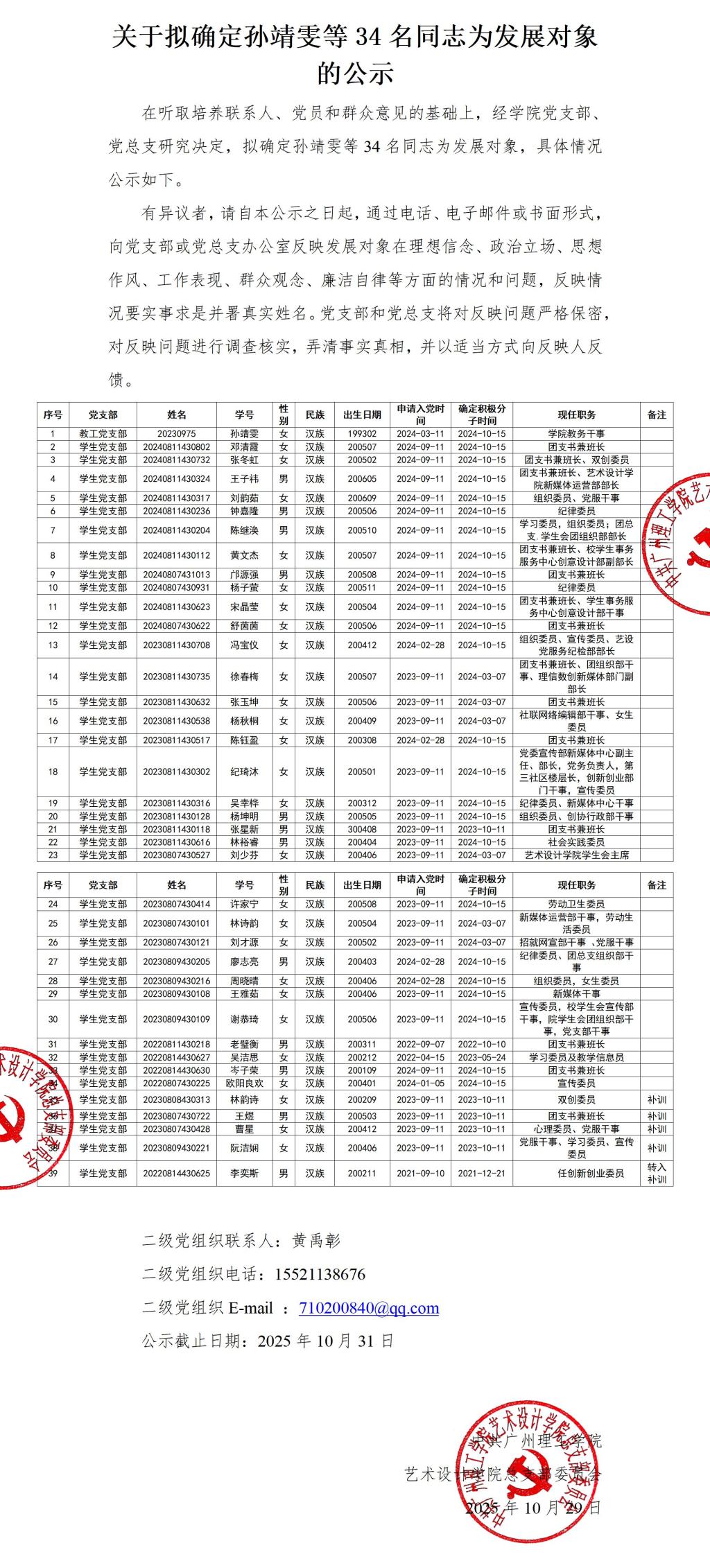 关于拟确定孙靖雯等34名同志为发展对象的公示