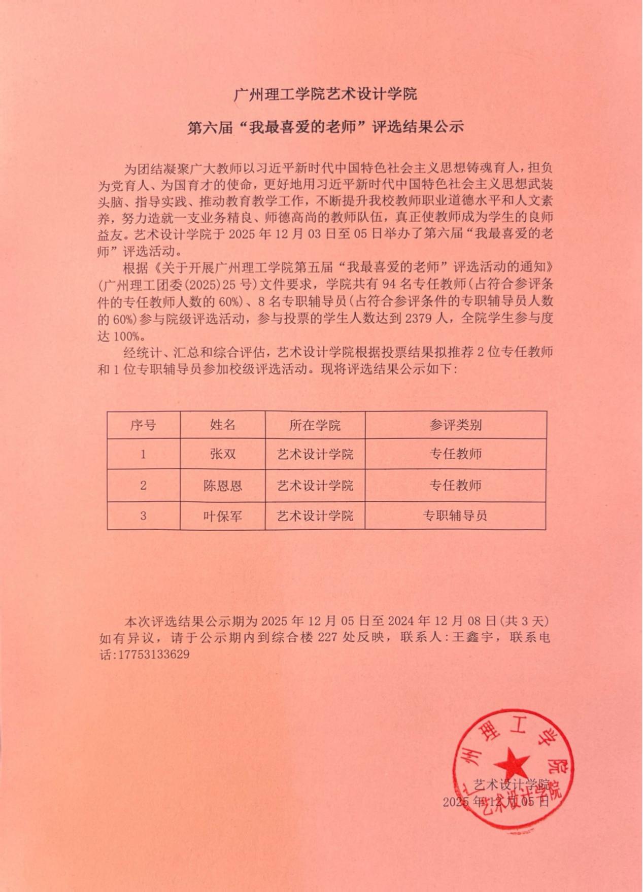 为团结凝聚广大教师以习近平新时代中国特色社会主义思想铸魂育人,担负为党育人、为国育才的使命,更好地用习近平新时代中国特色社会主义思想武装头脑、指导实践、推动教育教学工作,不断提升我校教师职业道德水平和人文素养,努力造就一支业务精良、师德高尚的教师队伍,真正使教师成为学生的良师益友。我校开展了广州理工学院第六届“我最喜爱的老师”评选活动,suncitygroup太阳新城根据投票结果拟推荐2位专任教师和1位专职辅导员参加校级评选活动。
