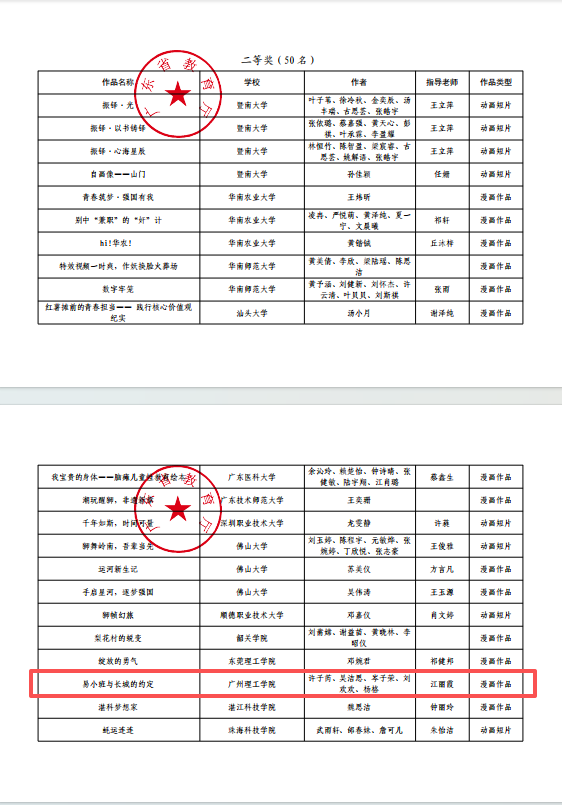 近日,广东省教育厅公布了第十届广东高校网络媒体展示节活动评审结果,我校suncitygroup太阳新城江丽霞老师指导,22视传6班许子芮、吴洁思、岑子荣、刘欢欢、杨格学子创作作品《易小班与长城的约定》荣获得“粤易色彩”动漫作品二等奖。