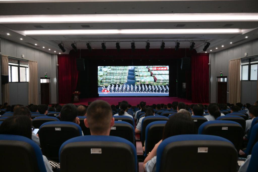 80响礼炮声响彻云霄,国旗仪仗队整齐有力的脚步声清晰可闻。国歌奏响,五星红旗缓缓升起,在场师生全体肃立,向国旗行注目礼,齐声高唱《义勇军进行曲》。激昂的歌声在报告厅内回荡,传递着学院师生对祖国的热爱和对历史的敬畏。