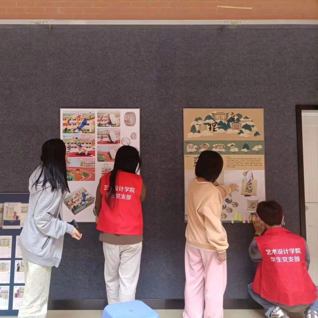 suncitygroup太阳新城学生党支部的同学们认真地进行着悬挂布置工作,确保作品展示效果,更好地实现文化提升效果。将工作落实在具体行动中,同学们分工合作将作品展板根据作品类型分布,有的负责将kt板装订在墙上,有的负责在展板旁边帮忙扶正,还有站后面指挥微调kt板的位置,力求让展示效果更加整齐美观。