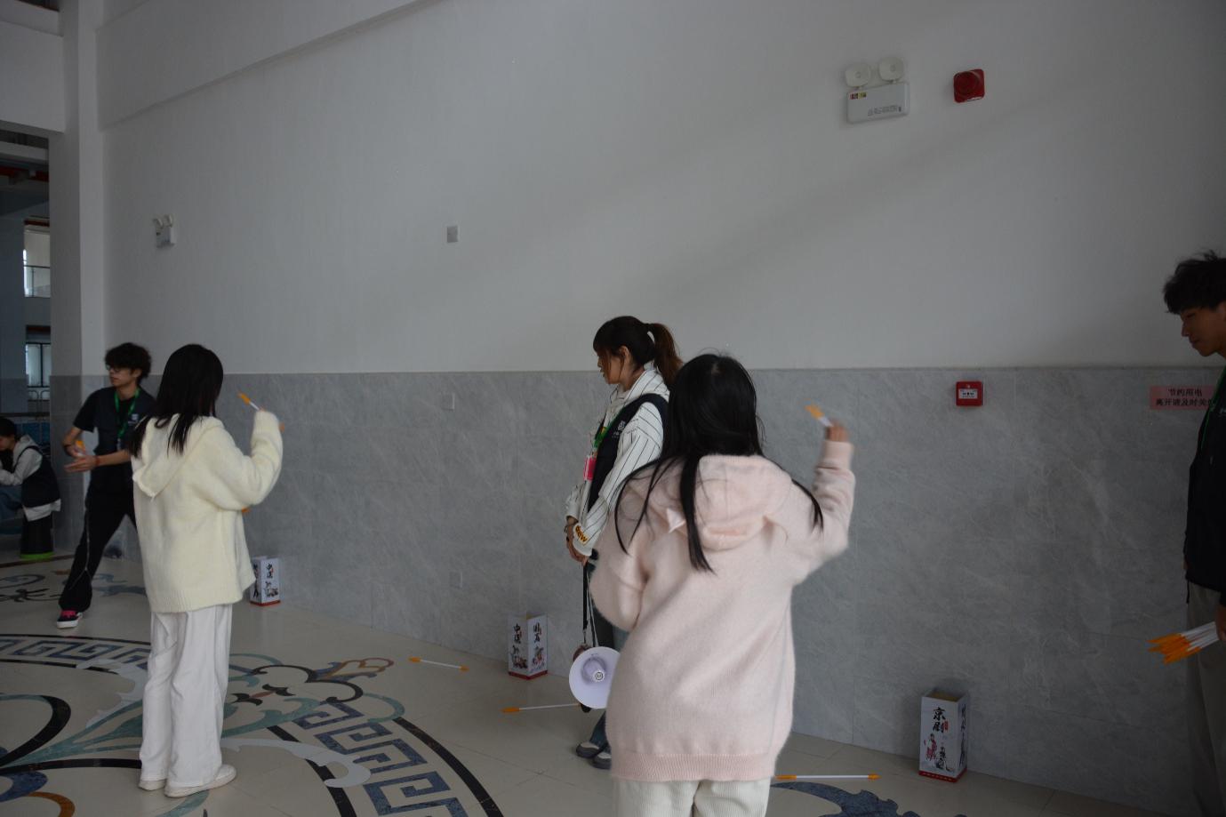 活动现场,全体新生在操场集结,工作人员详细讲解活动规则与路线地图,并引导大家进行热身运动。活动的号角吹响后,新生们以团队为单位,手持地图奔赴各个点位闯关。桂花林的“镖翼纷飞”、图书馆的“看图片猜词语”、3栋306的“古诗词填空挑战”、羽毛球场的“集体造型拍照”等趣味游戏,将体育、智育与美育深度融合,不仅考验着大家的即时反应,更在一次次协作中铸就了深厚的团队默契。各点位志愿者全程负责游戏组织、计时打卡与安全保障,操场医疗点配备急救包与常用药品,为活动安全提供了坚实保障。