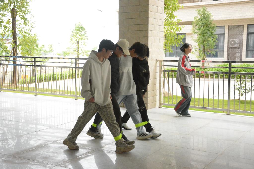 随着裁判一声令下,比赛正式拉开帷幕。各队队员肩并肩、腿绑腿,以“步调一致”的节奏向终点协力冲刺。“一二、一二”的整齐口号响彻操场,参赛队员们眼神专注、步伐统一,各队展现出不同的行进风格。部分队伍节奏稳健,沉着地向终点迈进;也有队伍凭借高度默契实现快速超越。比赛中即便偶有步调不一,队员们也能迅速调整、彼此扶持,展现出良好的团队素养与协作精神。