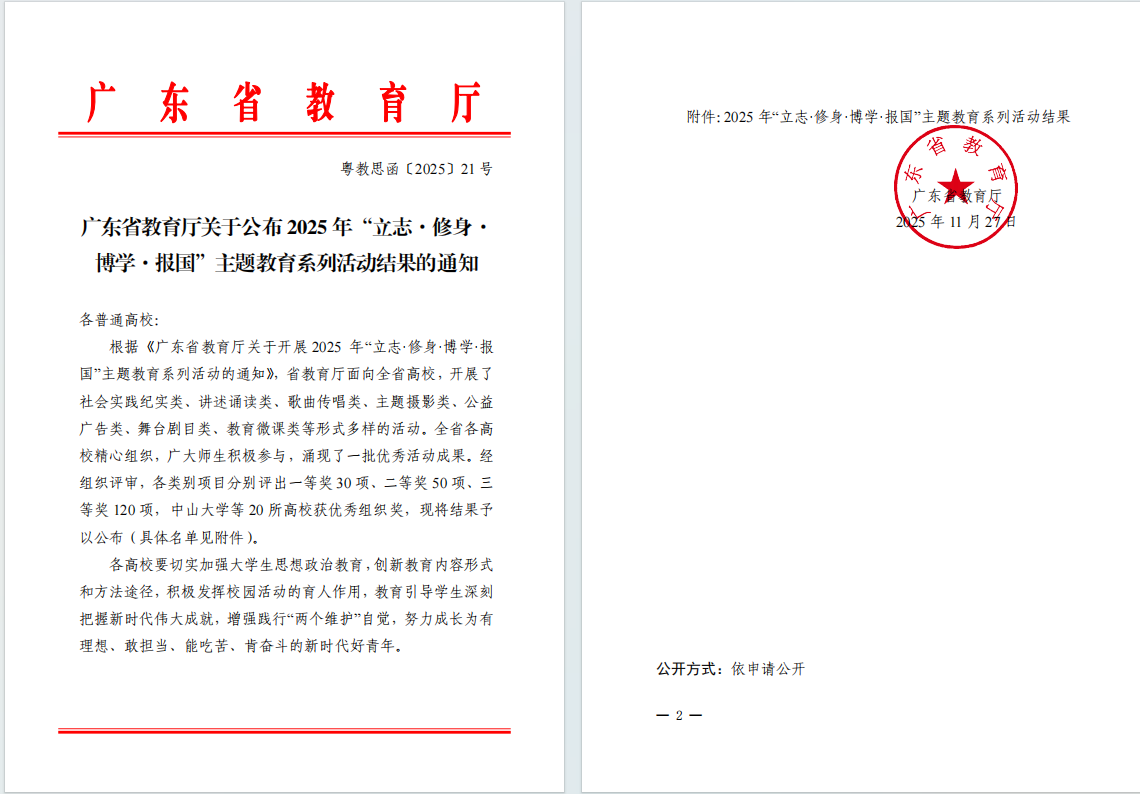 近日,广东省教育厅公布2025年“立志・修身・博学・报国”主题教育系列活动获奖结果,我院师生深耕艺术设计创作领域,凭借扎实的专业功底与深刻的主题表达,在众多参赛作品中脱颖而出,一举斩获公益广告类省级一等奖1项、省级三等奖2项,以亮眼成绩彰显艺设学子的设计实力与责任担当。