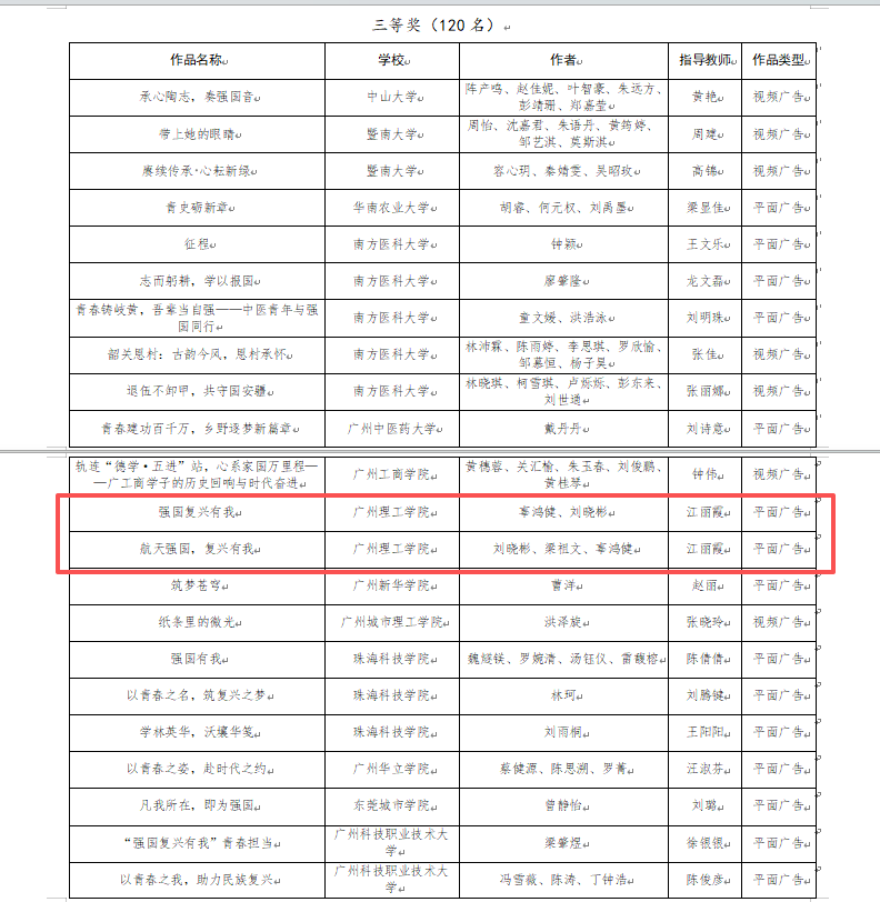 我院高度重视此次活动,将其作为强化学生思想政治教育、展现艺术设计专业教学成果的重要契机,精心组织动员教师开展创作指导,鼓励学生结合平面广告的视觉传达特性,以构图、色彩、符号等设计语言,诠释”立志・修身・博学・报国”的时代内涵。最终,由江丽霞老师指导,22视传6班许子芮、吴洁思同学创作的《青春力量,共筑强国梦》作品获得省级一等奖,22视传6班辜鸿健、刘晓彬创作的《强国复兴有我》作品获得省级三等奖,22视传6班刘晓彬、梁祖文、辜鸿健创作的《航天强国,复兴有我》作品获得省级三等奖。3件平面广告作品凭借鲜明的主题立意、新颖的创意表达和扎实的制作功底成功突围,在该类别奖项中占据重要席位。
