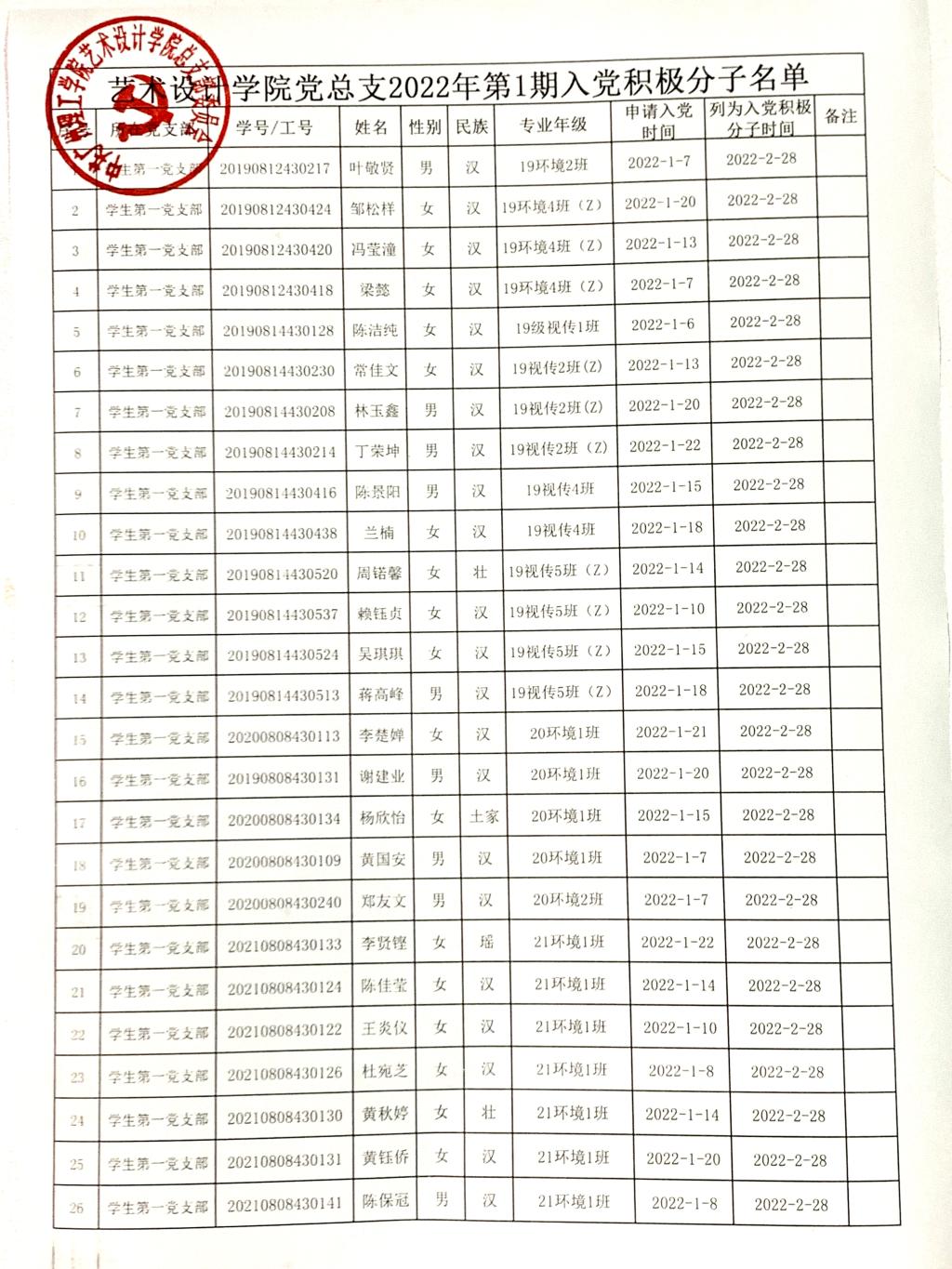经本人申请,所在支部一个月以上的培养教育考察,叶敬贤等39名同志列为2022年第1期入党积极分子(名单见附表)。根据《中国共产党章程》和《中国共产党发展党员工作细则》,现将发展对象的基本情况予以公示。