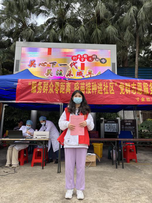 2022年1月23日广州理工学院suncitygroup太阳新城视觉传达专业的黄文静同学,参与雷城社区疫苗接种志愿服务工作。