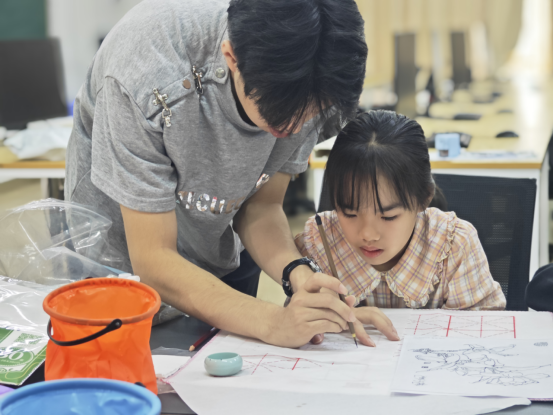 国画班本周课程主题是“栀子花”,栀子花在中国文化中有着深刻的内涵,用笔墨来传递绘画的力量,让小朋友们汲取栀子花中坚韧不拔的精神力量。课堂上,首先老师带领同学们巩固握笔的姿势,手把手带领小朋友学习画栀子花形的用笔与技法。练习过后,用铅笔在画纸绘制线稿,在栀子花形稿基础上用毛笔来勾勒出图形并上色。