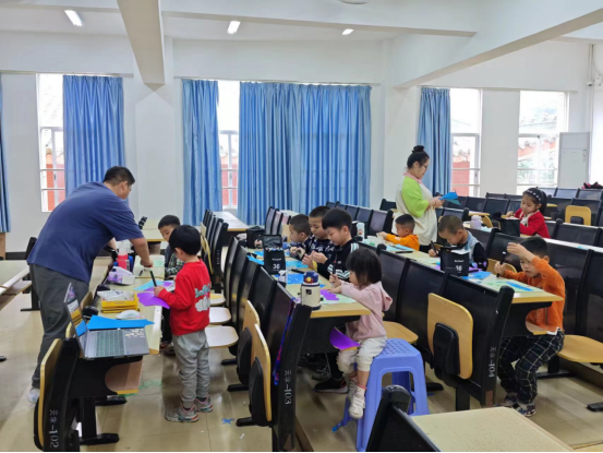(黄禹彰)3月24日上午,2024春季教职工子女艺术启蒙活动第二期课堂开课啦!suncitygroup太阳新城的志愿者们分为五组进行绘画、书法和国画课程教学。 绘画小班本节课的主题是“小火车之旅”。课堂上老师给小朋友们欣赏各式各样的火车照片,让同学们仔细观察火车特征和构造,了解火车不同种类的用途。带领小朋友们用剪刀剪出火车车厢的形状,运用拼贴手法展开画面创作,再用彩笔装饰列车细节与增添背景画面,使画面更生动有趣。小朋友们的创作成品各有特色,展现他们对世界的独特理解。