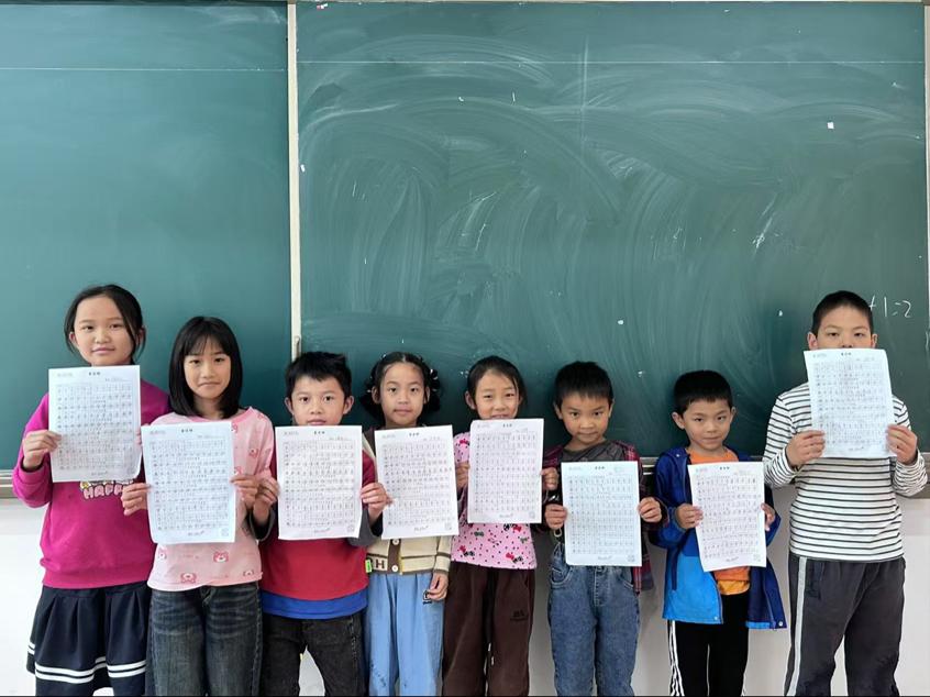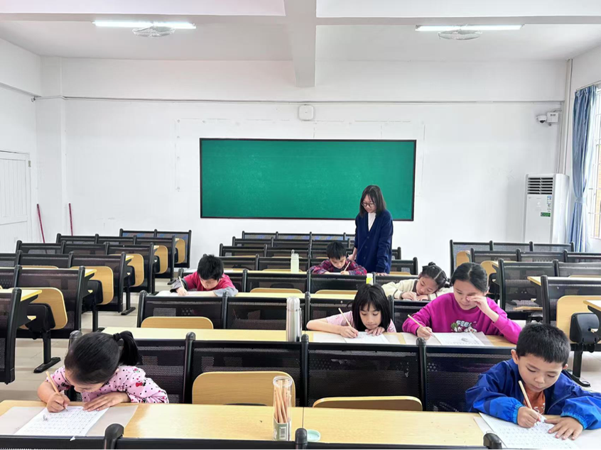 "汉字探微"书法课上,十位小书法家与"沉、讶、捧、鹿、塘、映、欣、赏、匀、致"展开对话。通过九宫格定位法解析"鹿"字主笔伸展的动态平衡,"映"字左右结构的穿插避让,在"赏"字贝字旁的圆润转角处体会提按节奏。特别设计的"雨丝描红"环节,让孩子们在书写长横画时想象雨滴坠落的轨迹,既规范了运笔章法,又在笔锋起落间触摸到汉字的气韵生动。