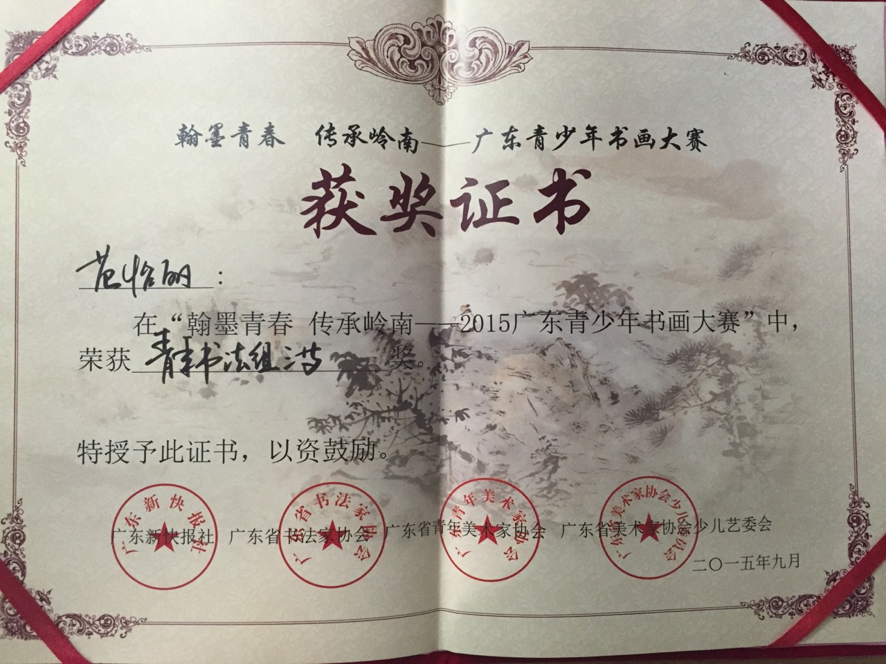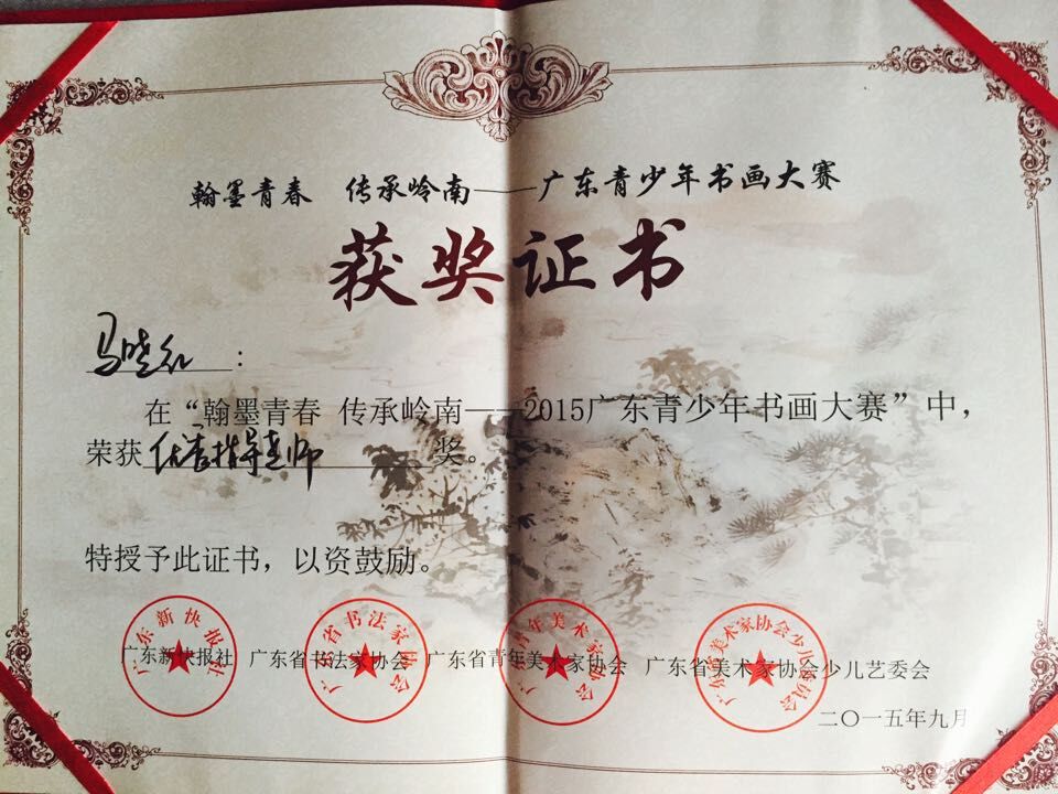 10月17日,“2015广东青少年书画大赛颁奖典礼”在广东广播电视台演播厅里盛大举行。我院书法专业大二、大三学生,在靳继君、马晓红两位老师指导下,古典、李浩明、李倩、李学文、李怡君、梁慧婷、欧阳小婷、潘婷婷、潘振钊、阮秋瑜、肖秋明、曾玲、张巧怡、张蔚锋等14位同学获优秀奖,范怡丽、吴金秀两位同学荣获三等奖,马晓红老师荣获优秀指导老师奖。