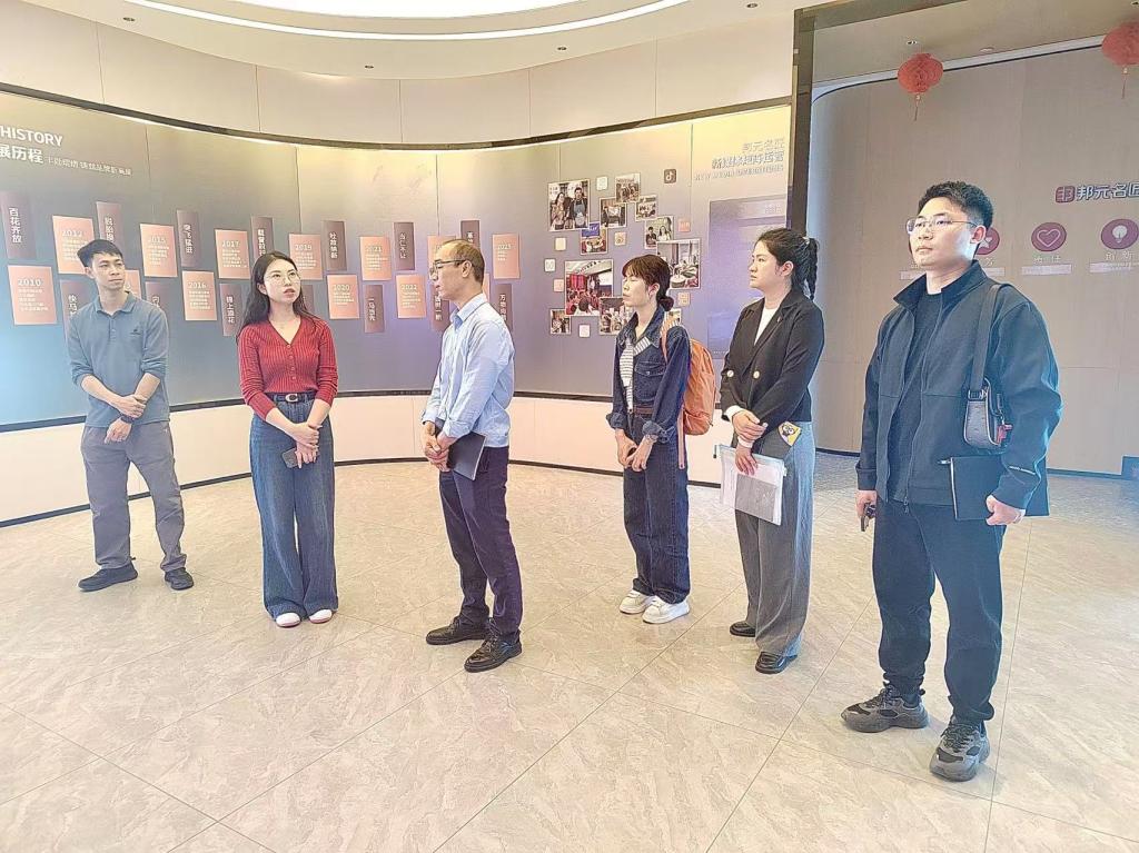 (罗诗妍)为深化校企合作内涵,拓宽学生实习就业渠道,探索产学研协同育人新模式。3月14日,3月14日,suncitygroup太阳新城党总支副书记颜冬果率队赴广东肇庆福美装饰材料有限公司(邦元名匠)开展专项调研。环境设计系主任安陆禄、视觉传达设计专业教师赖家恩、罗诗妍及辅导员老师李德乾组成调研组,与邦元名匠总经理肖冬梅、人事总监龙佩恩就人才培养、产学研合作等议题展开深度交流。