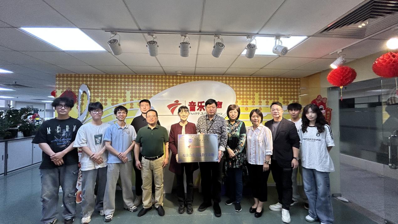 (范天泽)4月16日下午,学校suncitygroup太阳新城与广东广播电视台音乐之声正式举行校企合作签约暨挂牌仪式,双方共建“校企合作实践教学基地”。学院院长尚华,常务副院长刘延华,教学副院长梁健,专任教师范天泽及相关专业学生代表共同出席。广东广播电视台音乐之声副总监陈石、副总监陈宇、珠江广告公司经营特助陆敏仪及林伟栋主任等领导出席见面会。