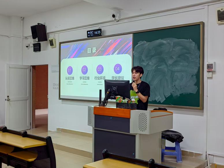在分享“三维艺术之旅”的过程中,陈景阳特别强调了“视角”的重要性。他提到,无论是做设计还是做产品,都不能只停留在默认的“前视图”或“顶视图”,而要敢于切换到“用户视角”,真正去理解需求、解决问题。他还用自己在赛纳科技参与全彩打印机研发的经历为例,讲述了艺术生如何在工业研发中找到独特价值,并鼓励学弟学妹们不要被专业标签限制,要勇于把创意“打印”进现实。