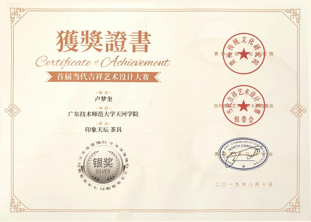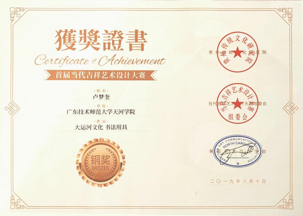 2019年9月,在首届当代吉祥艺术设计大赛中,我校suncitygroup太阳新城产品设计专业16级学生卢梦奎两份作品《印象天坛茶具》和《大运河文化书法用具》(指导老师李林)分获银奖和铜奖。