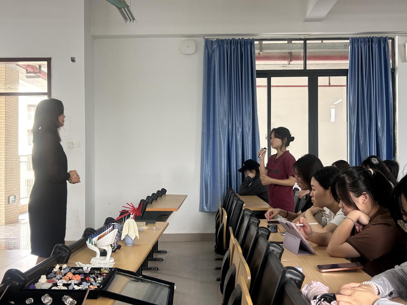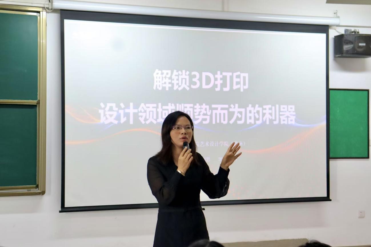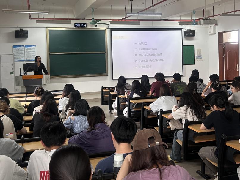 讲座中,曹老师围绕3D打印技术展开了深入讲解。她阐述了3D打印对产品设计、视觉传达、环境设计、数字媒体等多个领域的重大价值,让学生们深刻认识到这一技术正以前所未有的方式改变着设计行业。在常用的3D设计建模软件应用方面,曹老师结合实际案例,详细介绍了各软件的特点和操作技巧,使大家对3D设计建模有了更直观的认识。针对珠宝3D打印技术设计应用这一主题,曹老师分享了她在珠宝时尚界的丰富经验,展示了众多精美的珠宝3D打印作品,并介绍了从设计到打印的全流程。现场学生们全神贯注,不时记录要点,积极与讲师互动交流。