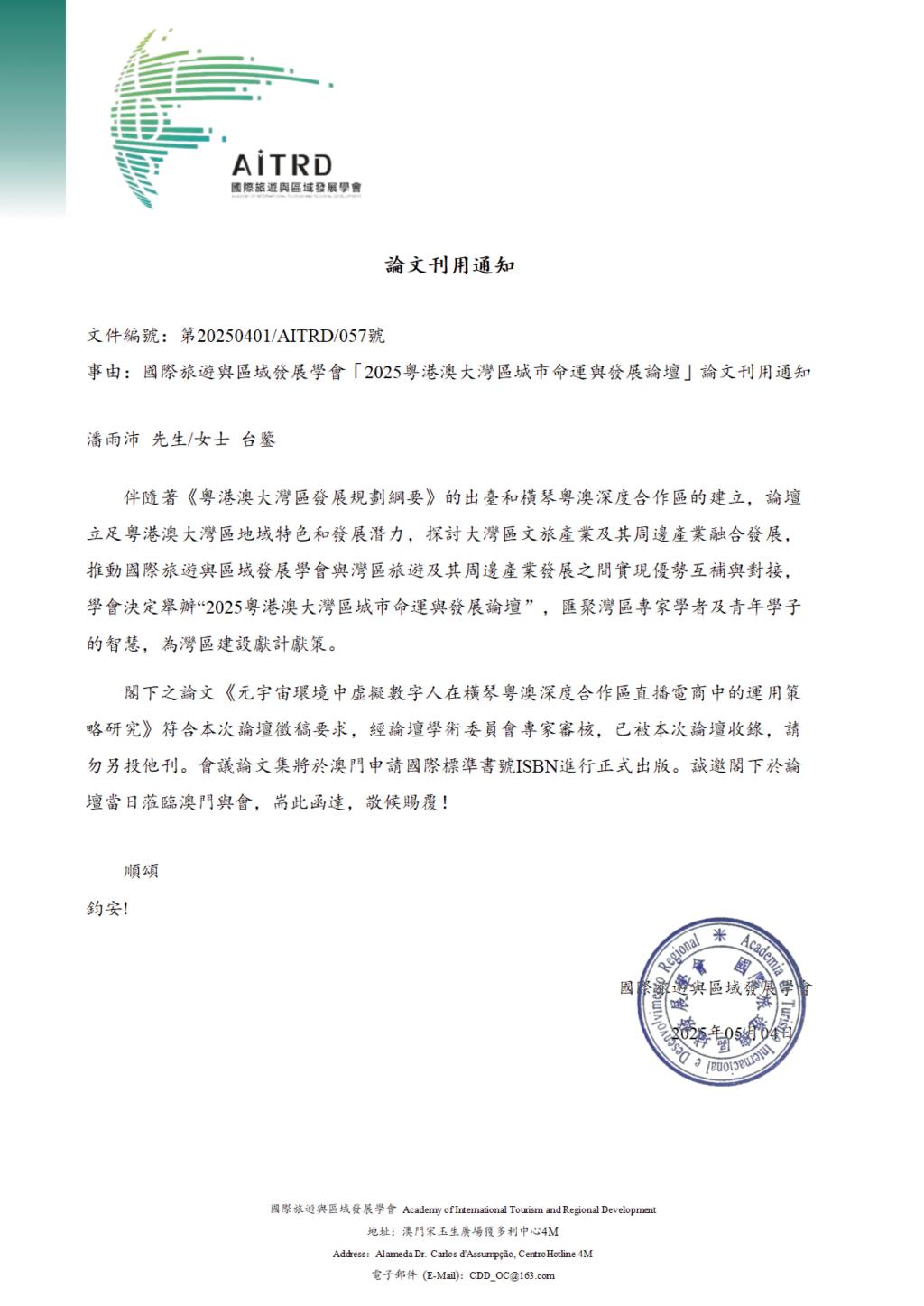 (潘雨沛)5月18日,由国际旅游与区域发展学会主办,澳门基金会支持的“粤港澳大湾区城市命运与发展论坛”于澳门励庭海景酒店多功能会议厅顺利召开。我院视觉传达设计系潘雨沛老师的论文《元宇宙环境中虚拟数字人在横琴粤澳深度合作直播电商中的运用策略研究》被论坛录用,并受邀出席了本次论坛进行论文交流,潘老师以元宇宙电商为题与参会专家们进行了交流探讨,其观点获得了在场专家的认同,该论文也被收录进本次会议的论文集,进行了公开出版。
