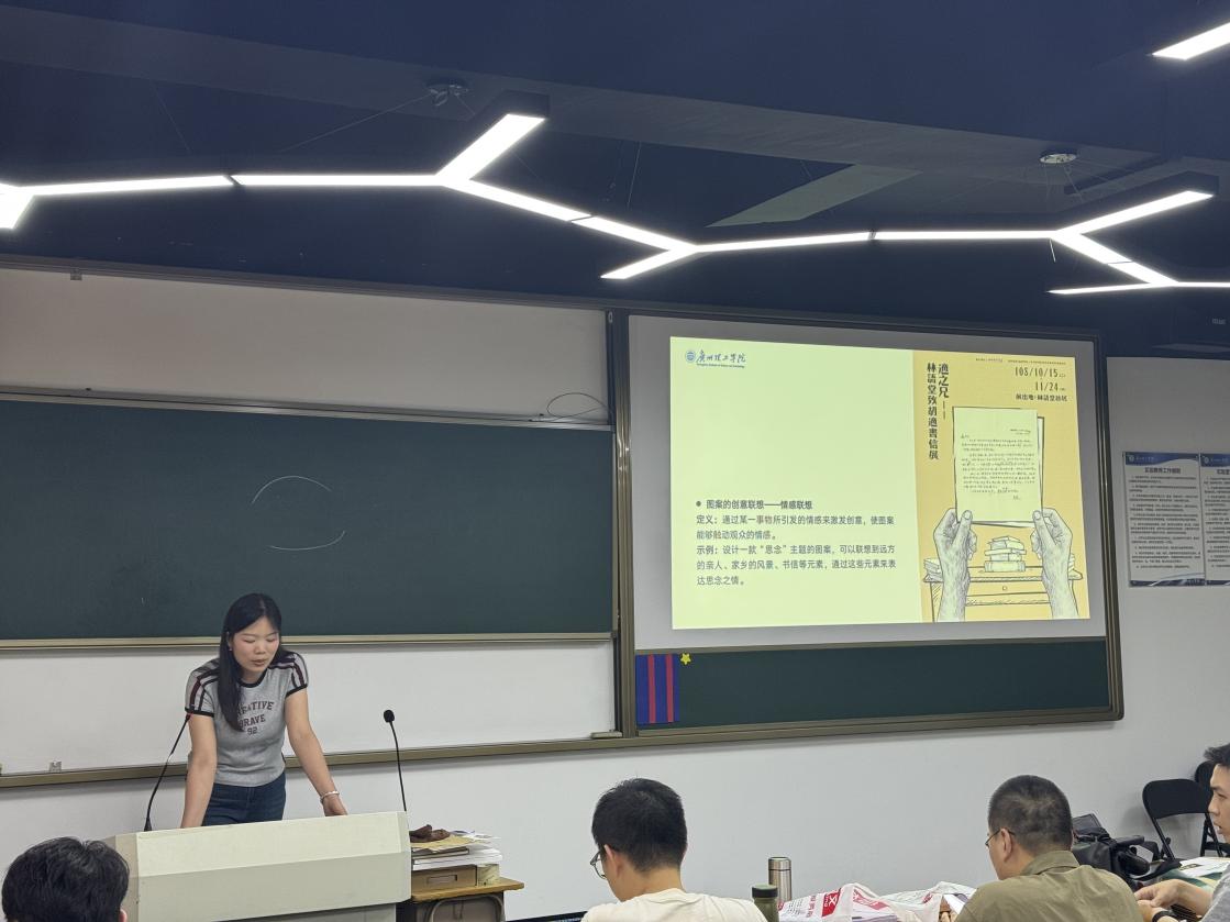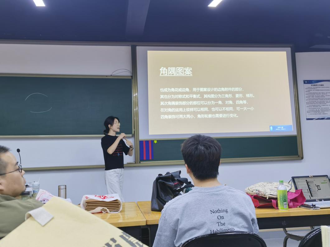 权思维老师以《文创设计的类型》为主题,系统梳理了文创设计在实用性、美学性与文化延展性之间的关系,提出课程中应重视引导学生挖掘地域文化资源,提升设计表达的原创性与落地性;潘思婷老师讲授了《图案的创意四维与创作方法》,从形、意、情、技四个维度出发,深入探讨图案创作的思维路径与教学策略,强调创意表达与技法探索的融合;罗诗妍老师围绕《图案的组织结构类型》展开讲解,详尽解析了对称式、发散式、单元重复式等图案结构的教学重难点,提出以实例演示辅助学生理解抽象概念的有效方法。