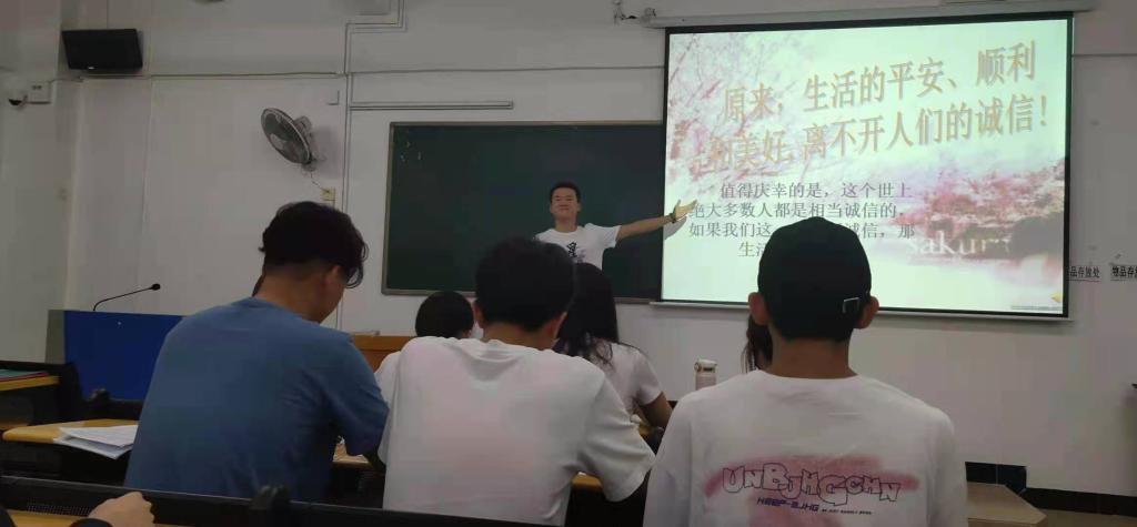 本活动首先由全班同学参与,活动前开展小组讨论,每个小组派一名代表在班里进行介绍。每个小组代表的上台,以“诚信”为切入点,分别阐述了自己小组对诚信的见解。在讨论过程中,学生们踊跃发言,和大家分享了自己的感悟与理解,寻找自身在诚信方面的缺失,内容涉及到了学习、工作、生活等等,并通过讲诚信故事、分享诚信名言等多种方式,使学生理解什么是诚实守信,懂得诚信的重要性,让大家恍然大悟,受益匪浅。也有同学分享了自己的反面事例,他用切身体会告诫大家不要做缺失诚信的事情,要做一个讲诚信的人,一定要坚定自己的信念,坚决抵制诱惑。结尾时,王文远班长总结大家的发言,并鼓励我们自尊自信,做个诚实的人。活动最后由班长给大家宣讲此次班会的主题内容、目的和此次班会的作用,以及诚信在日常生活的重要性。