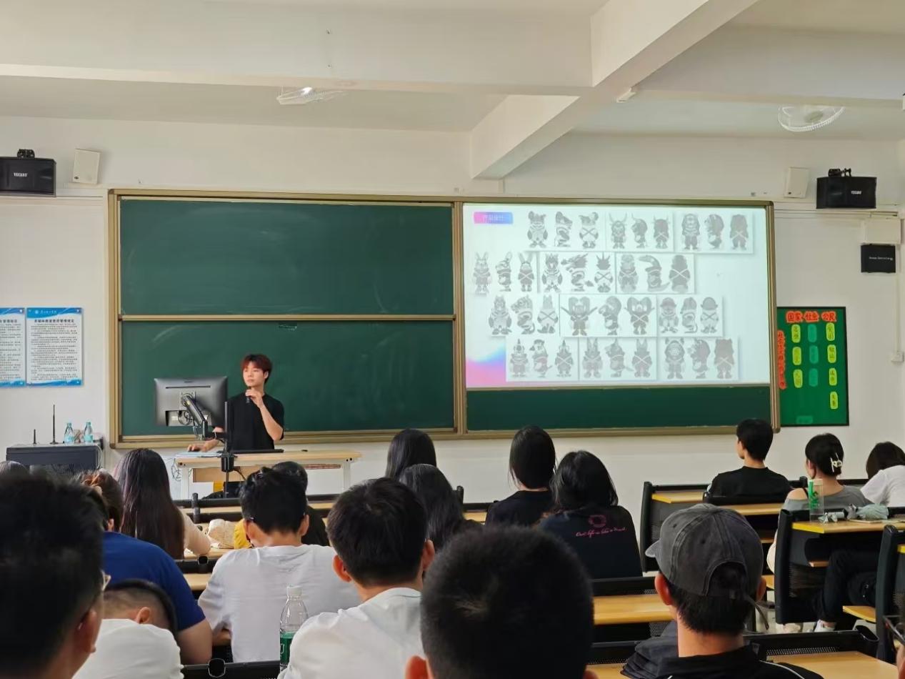 陈俊雄目前从事包装设计工作,是单位的设计骨干。陈俊雄同学讲述了他如何将学院的理论知识与实践相结合,创造出具有影响力的设计作品。他强调了持续学习的重要性,并鼓励新生们勇于尝试,不断挑战自我。陈俊雄学长不仅回顾了自己在校园内的学习经历,还详细阐述了他如何将学术知识转化为职场上的实际技能,以及在面对职场挑战时的应对策略。他的分享充满了实用性和启发性,为新生们提供了宝贵的参考。