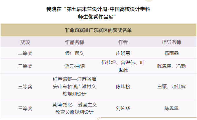 5月9日,第七届“米兰设计周-中国高校设计学科师生优秀作品展”非命题赛道广东赛区拟获奖名单公布,经过5天公示,我院杨雨霏、陈恩恩、冯勤、白颖、赵佳辉老师指导的六位学生庄晓慧、伍桂坪、曾锐伟、叶世源、陈炜松、刘婉华取得了本科生研究生组二等奖1项、三等奖3项的荣誉。