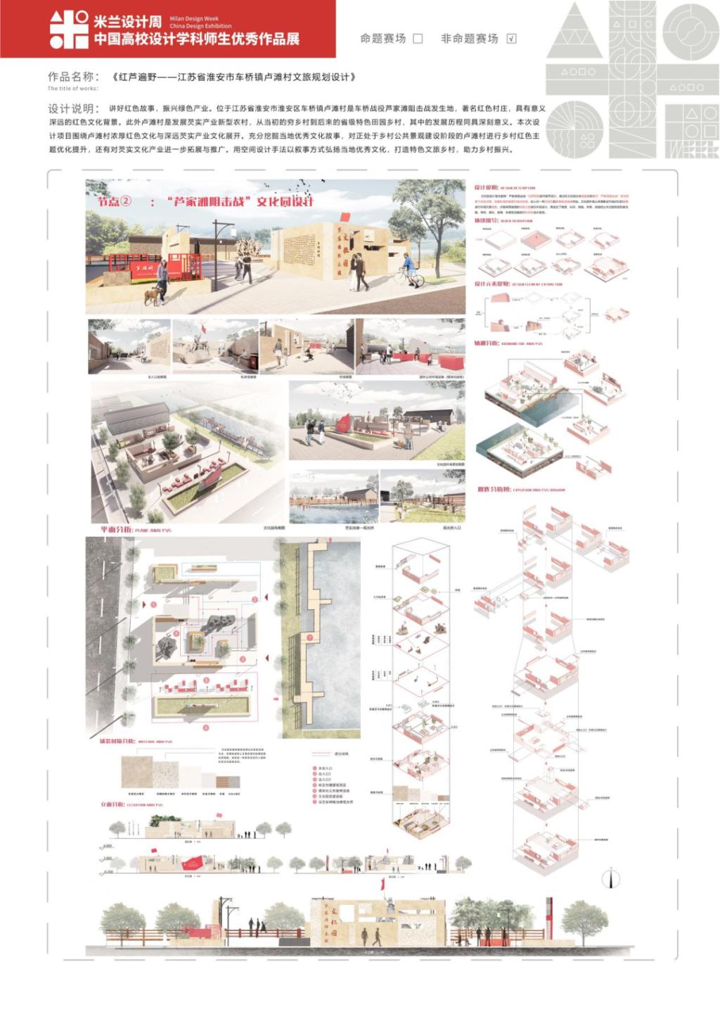 陈炜松的作品《红芦遍野—江苏省淮安市车桥镇卢滩村文旅规划设计》,围绕卢滩村浓厚红色文化与深远芡实产业文化展开。充分挖掘当地优秀文化故事,对正处于乡村公共景观建设阶段的卢滩村进行乡村红色主题优化提升,还有对芡实文化产业进一步拓展与推广。用空间设计手法以叙事方式弘扬当地优秀文化,打造特色文旅乡村,助力乡村振兴。
