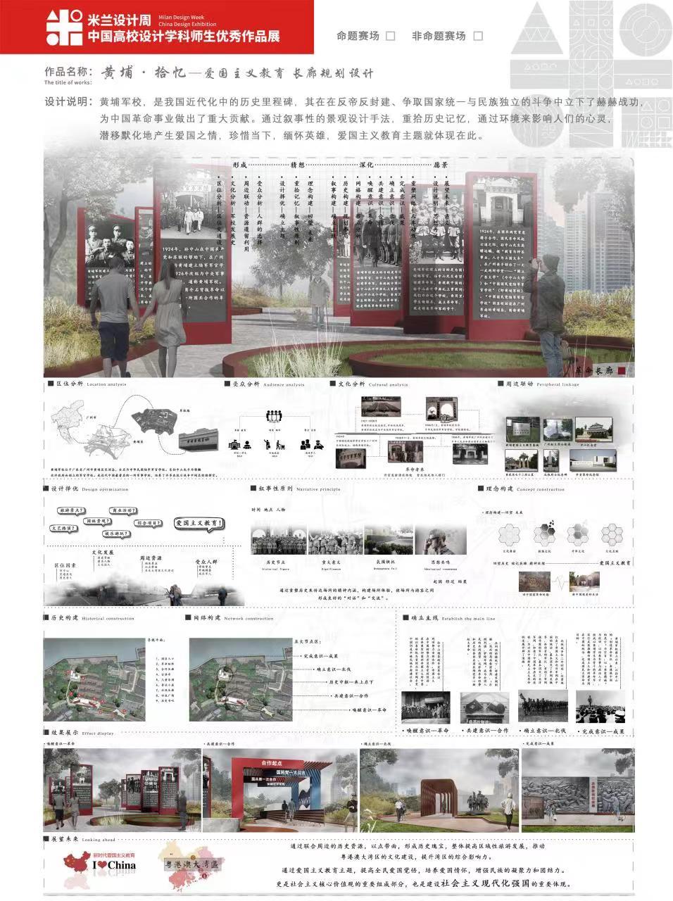 刘婉华作品《黄埔·拾忆—爱国主义教育长廊规划设计》,是以提升城市形象为目的的广州军校路的活化与更新设计。方案通过叙事性景观的设计手法,重拾历史记忆,利用环境弘扬爱国主义精神。