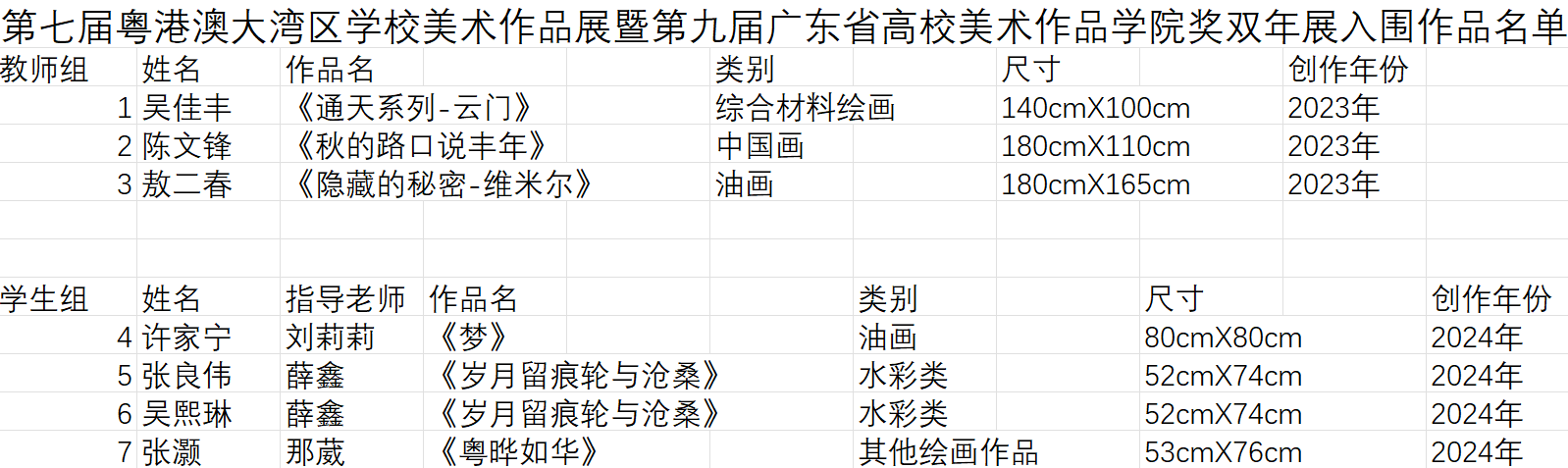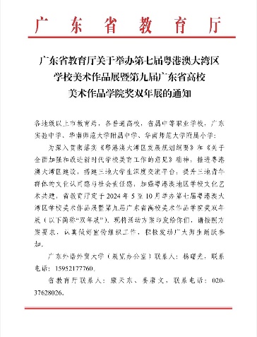 近日,由广东省教育厅举办的第七届粤港澳大湾区学校美术作品展暨第九届广东省高校美术作品学院奖双年展入围作品名单揭晓,我校suncitygroup太阳新城师生在此次展览中取得了优异成绩,共有6件佳作入围。
