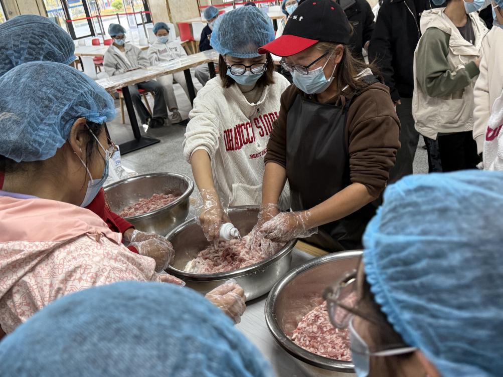 在现场,工作人员不仅分享了腊肠腊肉的传统制作工艺,还介绍了现代烹饪技术在其中的应用,让师生们对这一传统美食的制作过程有了更深入的了解。同时,活动特别设置了亲身体验环节,为师生们提供了一个难得的实践机会。在工作人员的指导下,师生们纷纷卷起袖子,亲自动手参与腊肠腊肉的制作。从调配香料、填充肉馅到缠绕肠衣,每一个步骤都做得有模有样,现场充满了欢声笑语。